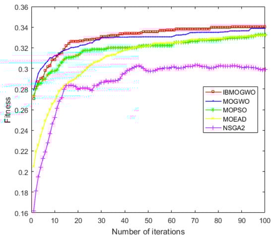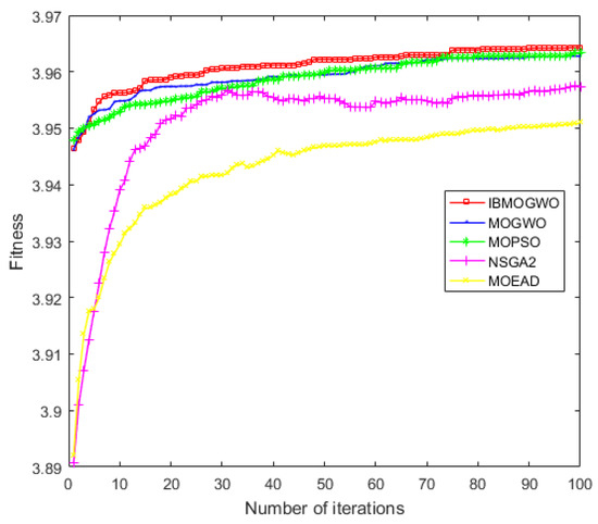 To further illustrate the advantages of the MBB-MOGWO algorithm, we averaged the experimental results of 20 tests for each algorithm and plotted the change trend of the fitness values, which shown in Figure 10 and Figure 11.