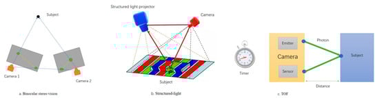 Currently, most of the livestock acquisition equipment employs depth cameras, a pioneering approach that maximizes animal welfare and provides improved means to assess animal health and reactions [,]. Depth cameras, also referred to as 3D cameras, discern the depth distances within the captured space, setting them apart significantly from standard RGB cameras. The presently used depth cameras can be categorized into three types based on their operating principles: binocular stereo vision, structured-light, and time-of-flight (TOF), as illustrated in Figure 2. Table 2 contrasts the advantages and disadvantages of these camera types, along with their key manufacturers, based on their fundamental principles. Table 3 further compares these cameras based on aspects like resolution, accuracy, frame rate, lighting conditions, and cost. Binocular stereo vision, despite its resilience to lighting, often encounters image discrepancies due to changing lighting conditions, leading to matching failures or reduced accuracy in practice []. TOF cameras exhibit lower noise at longer distances and boast higher frame rates, rendering them more suitable for dynamic scenes []. Structured-light technology is power-efficient, mature, and better suited to static scenes []. Live body dimension intelligent measurement in the livestock domain primarily occurs in dynamic environments, making TOF cameras a more suitable choice due to their capacity to meet the data acquisition requirements, especially for such scenarios.