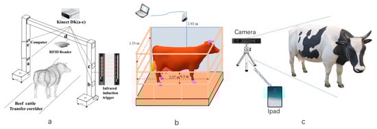 Main collection methods and equipment of livestock dimension measurement ((a). Channel arch type [], (b). Suspension fixed type [], (c). Simple and portable).