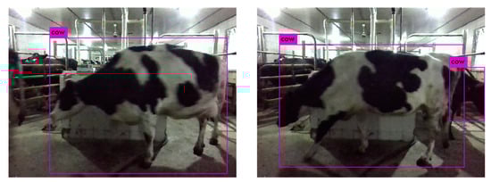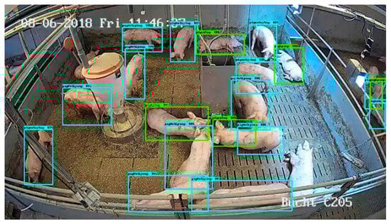 Martin et al. (2020) [] designed a deep learning system for position and pose detection, using the Faster R-CNN object detection pipeline and Neural Architecture Search (NAS) as the underlying network for feature extraction. This system can differentiate between standing and lying pigs, as shown in Figure 6, where the blue bounding boxes indicate standing pigs and the green ones indicate lying pigs. The method achieves an average precision of 80.2% for position and pose detection with a sufficient number of training images, but the precision is lower for datasets with limited training images. Jessy et al. (2022) [] extended the open-source pose estimation toolkit DeepLabCut, demonstrating its powerful capabilities in animal pose estimation, identification, and tracking using datasets of varying complexity. This method can evaluate the poses of various animals, offering a robust solution to distinguish different poses of the same livestock in images.