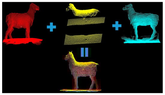 Three-dimensional point cloud registration and reconstruction of the livestock are generally the initial steps in livestock data processing. After obtaining the livestock’s point cloud data, the corresponding point cloud data are registered, and a three-dimensional point cloud is reconstructed to extract information for subsequent point cloud processing. Point cloud registration techniques include the ICP (Iterative Closest Point) algorithm, the NDT (Normal Distribution Transform) algorithm, and the PFH (Point Feature Histogram) algorithm. Typically, data captured from multiple viewpoints are matched to ultimately reconstruct the three-dimensional model of the livestock, as illustrated in Figure 7.
