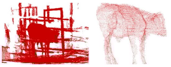 In a study by Zhang et al. (2023) [], after acquiring three-dimensional point clouds of cattle using depth cameras, statistical outlier removal was applied to eliminate sparse points, followed by RANSAC plane segmentation to remove ground points. Finally, a threshold-based cutting method was used to eliminate background points. While this approach produced reasonable results in terms of the cattle’s three-dimensional point cloud, it exhibited several limitations. It was constrained by the use of a single depth camera capturing data from only one perspective, leading to limited and non-universal data. Additionally, the cattle model used lacked versatility. On the other hand, Li et al. (2022) [] also utilized depth cameras for data collection in cattle farms. Their method involved a series of algorithms including spatial filtering, statistical outlier point filtering, random-sample-consensus-based shape fitting, point cloud downsampling, and density-based clustering to remove background interference, such as from fences, while preserving the integrity of the point cloud. This approach effectively extracted point clouds of target cattle from complex real-world environments, providing crucial support for subsequent operations like livestock measurement, as shown in Figure 8.
