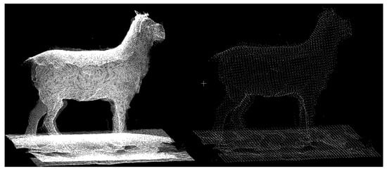 Livestock point cloud data typically exhibit a substantial data volume, leading to inefficiencies in data processing. To address this, a common practice involves point cloud simplification to retain the livestock’s essential features while improving the data processing efficiency [], as depicted in Figure 9.