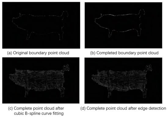 Li et al. (2021) [] presented a method for completing missing sections in side-view point clouds of pigs. This approach utilized threshold analysis, cubic spline curve fitting, and edge detection, as illustrated in Figure 10. Although it successfully addressed pig point cloud completion, the experiments were performed on model pigs, limiting its general applicability.