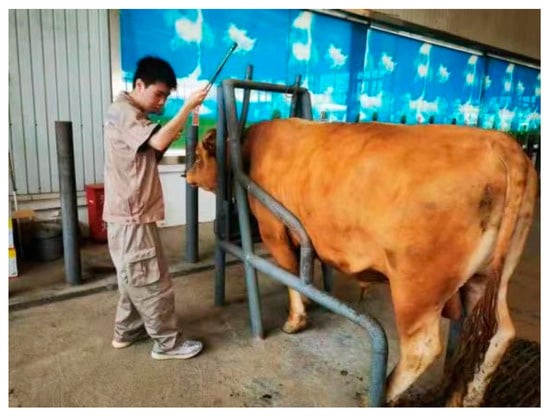 Body dimension measurement is a crucial indicator for assessing the growth and development of livestock. These measurements are typically expressed in numerical form using units such as length, angles, and areas to represent the size of various parts of the livestock, such as body height, body length, chest circumference, girth, etc. These measurements reflect the physical size of the livestock and hold significant importance for livestock management and breeding purposes [,]. Manual body dimension measurements often involve tools like measuring sticks and tape measures []. During the measurement process, the livestock are usually secured within a device made of iron to ensure the safety of the measurement personnel and to maintain the livestock in a proper posture. Measurements are then taken using the measurement tools, as shown in Figure 13.