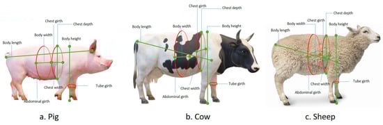 Currently, there are a wealth of livestock resources available []. Figure 14 illustrates the measurement standards for pigs, cattle, and sheep, which include various indicators such as chest circumference, abdominal circumference, body height, body length, body width, girth, chest depth, chest width, and more. Table 5 provides specific locations on the body of pigs, cattle, sheep, etc., where specialized measurement instruments are used for measurement purposes [,,]. The aforementioned morphometric parameters are commonly employed for phenotypic assessment in the breeding process.
