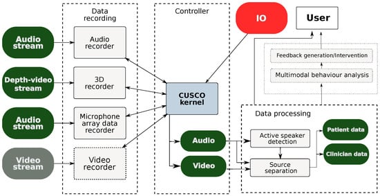 We describe a minimalistic embedded system named CUSCO (custom secured recorder) which focuses on audio-visual monitoring based on a small, portable and general-purpose architecture as shown in Figure 1. CUSCO was developed in the context of a research project on interaction analytics for automatic assessment of communication quality in primary care (INCA), where it supported the automated analysis of communication patterns in medical interviews such as consultations and briefings. This setting involves patient–clinician dialogues in real-world environments where the researcher has little control over the environment and recording conditions. The device supports data collection of medical interviews by recording audio, video, and depth video streams with quality levels suitable for use with automatic speech and video processing techniques, while the recorded data pass through the first stage of feature extraction and are encrypted upon collection.