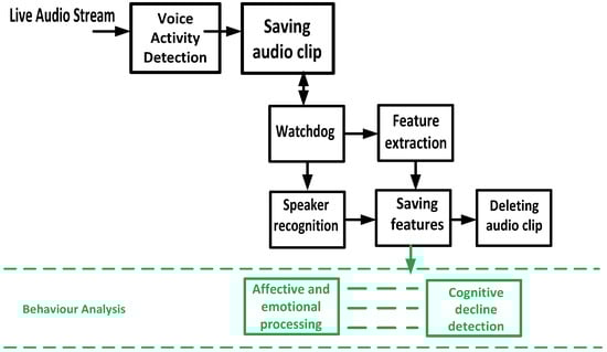 The method of feature extraction is shown in Figure 4. The Auditok library [39] is used for real-time speech chunk recognition by analysing the energy of the audio signal. The detected chunks are then stored as pulse-code modulation (PCM) streams. The input for the user identification module and audio feature extraction library [38] consists of these streams. The user recognition module analyses the input to differentiate between streams that include the voice of the target user and other noises, such as additional speech or background noise. The latter individuals are disregarded in order to provide further protection for the privacy of those who have not given consent to participate in the conversation in question. After extracting the privacy-preserving auditory information, the PCM streams are promptly erased. The software used in these processes can be accessed via our git repository (git@git.ecdf.ed.ac.uk:fhaider/saam-av-capturing-system.git). The extracted features are then used to detect emotion, and for cognitive impairment detection.