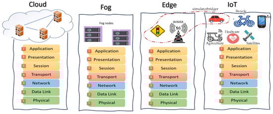 The IoT simulators may address aspects related to different OSI layers Figure 1, but each simulator does not cover all layers across all application domains comprehensively. This limitation is due to the vast diversity of requirements, protocols, and technologies across different IoT applications, as shown in Figure 1, which makes it challenging to develop a one-size-fits-all simulator. For instance, smart city IoT simulators like IoTSim-OsmosisRES and SimulatorBridger, in order to accurately simulate traffic and energy management, cover a broad range of the OSI model. While the main focus might be on higher layers: Application, Presentation, Session, and Network due to their direct relevance to application-specific simulations, but the physical layer is not simulated in these simulators. On the other hand, simulators focusing on agriculture may excel in simulating the Application layer’s pest and disease simulation and weather simulation but lack the depth to simulate lower layers like the Data Link or Network layers, which are crucial for detailed network communication simulations required in smart city applications.