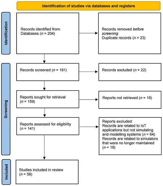 Our literature review aimed to provide a comprehensive and up-to-date overview of the IoT simulator landscape. This involved extensively exploring academic journals, conference proceedings, technical reports, industry publications, and online repositories. The goal was to collect a wide range of scholarly and industry-specific resources that would help understand the evolving IoT simulator field comprehensively. The following points are important to interpret the PRISMA flow diagram: