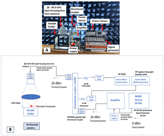 (A) The operational mmWave exposure system; (B) schematic diagram illustrating the exposure system and its components.