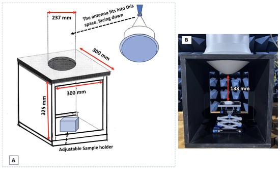(A) Schematic representation of the antenna holder, illustrating its shape and dimensions. (B) The antenna holder with the antenna in position and the sample holder being adjusted at a distance of 133 mm from the antenna to capture the focal spot.