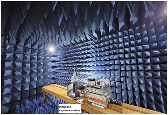The exposure procedures for this study were carried out in the RF anechoic chamber located at the 6G Research and Innovation Lab, Swinburne University of Technology. The walls of this anechoic chamber are equipped with pyramidal absorbers, as illustrated in Figure 3. The reduction of external and unwanted signals entering our anechoic chamber is achieved by shielding the chamber’s exterior with metal, reflecting noise signals. Utilising an anechoic chamber enhances its efficacy by significantly minimising external interference. Therefore, conducting experiments within this chamber establishes an ideal and controlled environment for studies involving RF frequencies.