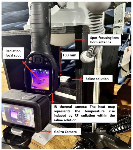 Temperature rise is the primary mechanism for non-ionising radiation exposure [35]; thus, it is crucial to investigate the current system’s proper functioning in generating RF radiation at 26 GHz with a focused beam. Furthermore, it is crucial to ensure that the system’s temperature measurement is precise and responsive, taking into consideration the properties of the sample. Thus, the initial phase of configuring this exposure system is dedicated to ensuring the optimal functionality of the entire setup and the precision of the IR thermal camera’s sensitivity. Once the system’s feasibility is confirmed, the subsequent phase can focus on operating it at various power levels to expose biological samples, including porcine eyeballs, cells, bacteria, etc.