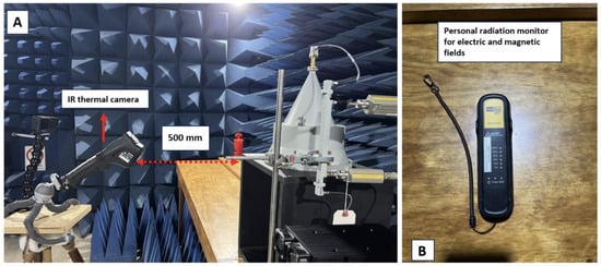 (A) Establishing a consistent placement for the IR thermal camera at a fixed distance on the rotatable mount to ensure consistent temperature distribution readings. (B) Utilising the 2XT Radiation Monitor, a wearable device for RF-EM field monitoring during the experiment, with frequency ranges for both E-field from 900 kHz to 60 GHz and magnetic (H)-field from 27 MHz to 1 GHz.
