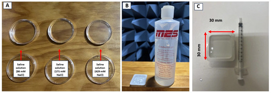 (A) Prepared saline solutions with varied NaCl concentrations by mixing distilled water and adding NaCl. (B) Conductive gel for ultrasonic and ECG; we transferred 6.5 mL of each solution to disposable weighing boat dishes measuring 30 mm × 30 mm (C) using a syringe. These dishes were then placed at the focal spot of the antenna with a spot diameter of 10 mm.