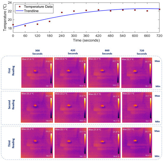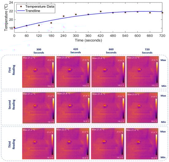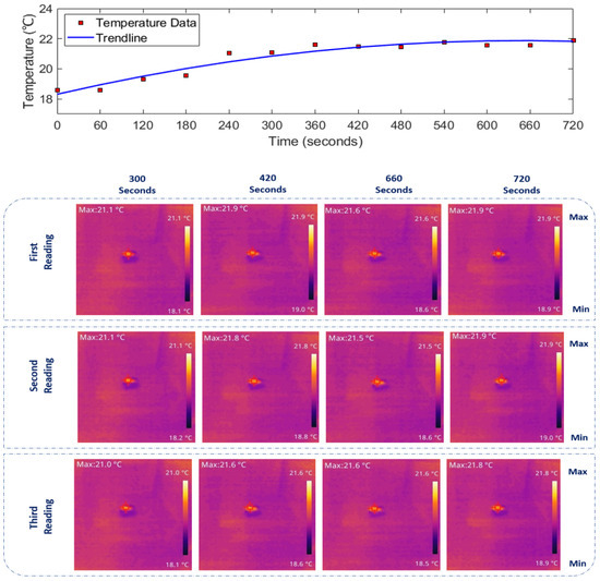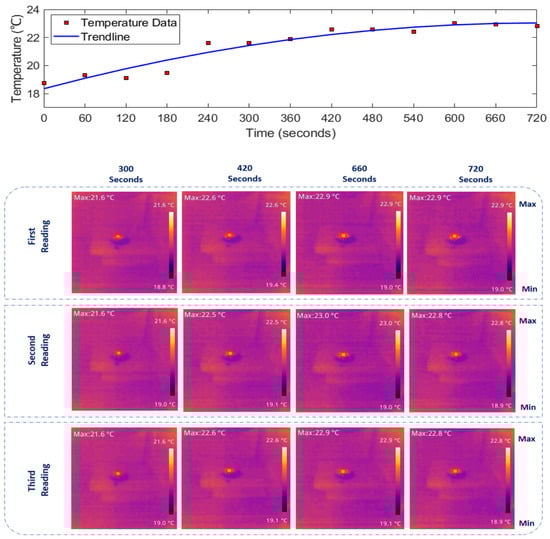 Given the extensive dataset recorded over approximately 12 min for each medium, including three readings per 60 s, presenting the full results in this paper is impractical. Therefore, specific time data sets (300, 420, 660, and 720 s) have been selected to represent when each medium reached its steady-state temperature. The thermal images depicting temperature rise in Figure 7, Figure 8 and Figure 9 (bottom panels) correspond to saline solutions with NaCl concentrations of 86, 171, and 428 mM, respectively. Similarly, Figure 10 illustrates the thermal image of conductive gel exposed to RF radiation at 26 GHz.