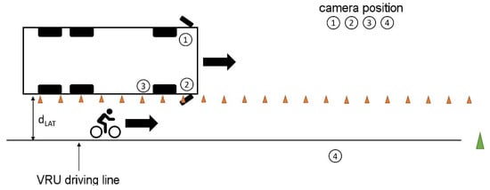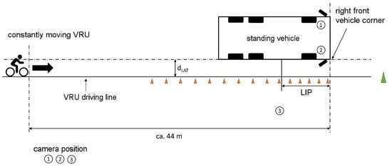 In the second static test described in Figure 2, according to UN-ECE R151 [], a VRU moved parallel to the longitudinal axis of the commercial vehicle from the rear to the front along its right-hand side. In contrast to UN-ECE R151, two lateral distances of 1.25 m and 4.25 m (dLAT in Figure 2) were investigated in the tests. The VRU started about 44 m behind the front of the commercial vehicle to make sure that the starting point was out of the detection range of the sensor systems.