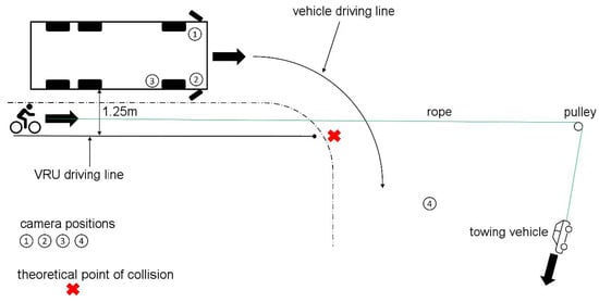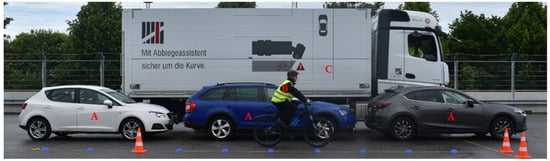 In the dynamic tests described above, based on UN-ECE R151, no intersection of the commercial vehicle and VRU trajectories, and thus no immediate risk of collision, was provoked. Accordingly, as intended, a maximum of the information signal from the turning assistance system can occur. For this reason, a further test setup has already been designed by the ADAC, which can also be used to provoke the occurrence of the warning signal of the blind spot assistance system. From an initially parallel movement of the commercial vehicle and the VRU with a lateral distance of 1.25 m, the commercial vehicle turns right at a defined point as shown in Figure 5. The VRU is represented by a bicycle dummy pulled by a test vehicle at a defined speed, as a collision between the two road users can occur without timely intervention by the commercial vehicle driver [,,].