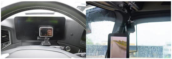 The experiments were recorded from several perspectives with video cameras. For this purpose, several compact action cameras of the type HERO8 Black from the manufacturer GoPro Inc. from San Mateo (CA, USA) were mounted on the driver’s cab of the respective freight vehicle, which filmed the driver’s perspective to the front, to the instrument cluster (Figure 6 right), and to the exterior mirrors on the right A-pillar (Figure 6 left). Another GoPro HERO8 Black was attached to the outside of the cab to record the movement of the VRU parallel to the road vehicle. In addition, the test sequence was filmed using two XA30 video cameras mounted on tripods from the manufacturer CANON from Tokyo (Japan) from the perspectives shown in the test sketches above. Action cameras were placed in front of the instrument display and the a-post inside the truck’s cabin, and outside at the right side of the cabin to film the VRU. The positions of the video cameras were chosen to film the movement of the VRU from the front and in a 90° angle from the side.