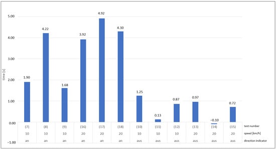 The dynamic turning tests result in a considerable difference in the triggering times for the warning message depending on the driver’s timely actuation of the right-hand direction indicator during the pre-collision phase. If the direction indicator was activated early, the warning signal would be triggered 3.9 s to 4.9 s before the calculated theoretical collision point during four test runs (Figure 9). In one case, the acoustic warning was issued 1.9 s before the collision, as the direction indicator was activated late. In a test run with the direction indicator activated, the acoustic warning was triggered 1.7 s before the point of a collision without any obvious cause.
