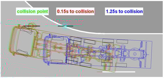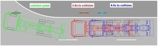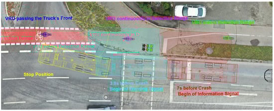 If, despite the measures listed, a turning accident occurs, its course of events often must be clarified by forensic accident analysts []. Of particular interest is often the clarification of the circumstances under which the driver of the road transport vehicle could have caused the accident. Since the blind spot assistance system is a pure warning system that does not actively interfere with the vehicle’s driving dynamics and is therefore intended to brake it independently, it must be analyzed whether or when the driver was visually or acoustically alerted to the VRU by the system while approaching the collision site in order to direct his gaze into the relevant mirror and to increase the urgency for braking action.