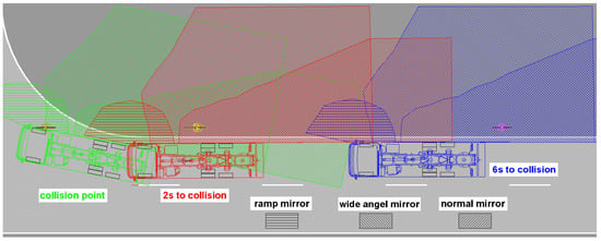 Figure 11 shows the reconstruction result of the same traffic accident constellation without considering a blind spot assistance system. Here, it was investigated when the VRU would be recognizable to the commercial vehicle driver in the reconstructed approach constellation, in which indirect fields of view are presented via exterior mirrors or camera systems. The area visible in the exterior mirrors of the Mercedes test vehicle to the right of the vehicle was measured and drawn into a scaled plan view. Figure 11 shows that the VRU is typically perceptible in at least one indirect field of view over several seconds before the collision.