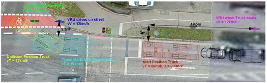 Similarly, and following the ADAC’s investigations [,,], dynamic tests were carried out in which the commercial vehicle and the VRU moved parallel to each other at different speed constellations with lateral distances of 1.25 m and 4.25 m, respectively, as described in Figure 4 and Table 3.