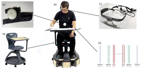A researcher provided uniform instructions to all participants before the experiment. Subsequently, each participant was instructed on how to affix the Aidmed-One, shown in Figure 1a, to the xiphoid process and correctly wear the eye-tracking glasses shown in Figure 1c. The participants were comfortably seated in the rotating chair, with a tablet and the task paper positioned at the centerline of their field of vision, as depicted in Figure 1b. Each participant completed the aiming task under six different experimental conditions, including two platform conditions (stationary, in-motion) and three IDs (easy, medium, difficult). To minimize any bias from learning effects, the order of these experimental conditions was counterbalanced. In the stationary conditions, a researcher verbally started the task with the command “Go”. In the in-motion conditions, a researcher initially rotated the chair back and forth for 10 s and then instructed the participants to begin the task with the same command, “Go”. The participants were tasked with swiftly aiming at and marking the points between the target areas while maintaining accuracy within the designated target areas. A researcher quietly kept track of the aiming actions made by each participant. The participants were required to stop the task immediately and prepare for the next experimental condition. After completing the trial under all experimental conditions, each participant was asked to complete a post-trial survey.