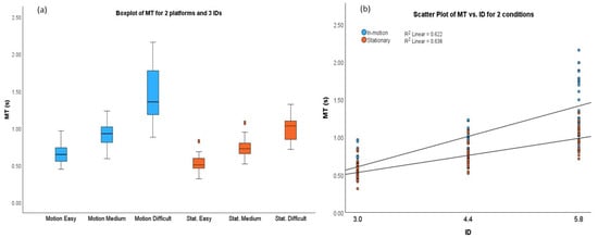 (a) Box plots of MT for two platform conditions (blue: in-motion; orange: stationary). (b) Scattered plots and linear regressions of MT for two platform conditions.