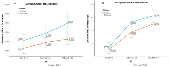 The average durations of each individual eye fixation and saccade were analyzed using the ANOVA model. The ANOVA showed that there was no significant interaction between the task IDs and platform conditions for the fixation duration (F = 1.96, p = 0.17), nor for the saccade duration (F = 4.37, p = 0.022). However, it revealed significant differences in the fixation and saccade durations for both the platform conditions and the IDs.