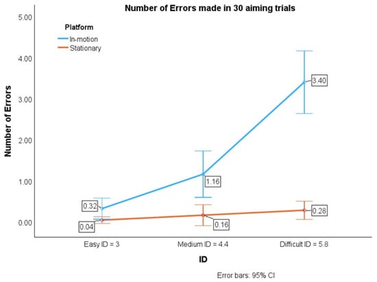 The average error for the in-motion conditions (Error_in-motion = 1.63) were 10.19 times more than that for the stationary conditions (Error_stationary = 0.16). Specifically, for the in-motion conditions, the average error was 8, 7.25, and 12.14 times more than that the average error values for the easy, medium, and difficult tasks, respectively, under stationary conditions. Overall, the error increased with the increase in IDs.