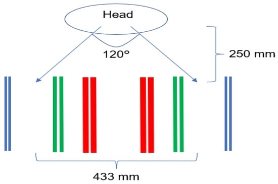 Third, the physical constraint of the subjects’ bodies under the in-motion conditions worsened their performances. Human eye vision can span approximately 120 degrees of arc []. In our experiment, participants’ head positions were approximately 250 mm from the task paper, providing an eye vision field coverage of about 433 mm on the task paper, as represented in Figure 5.