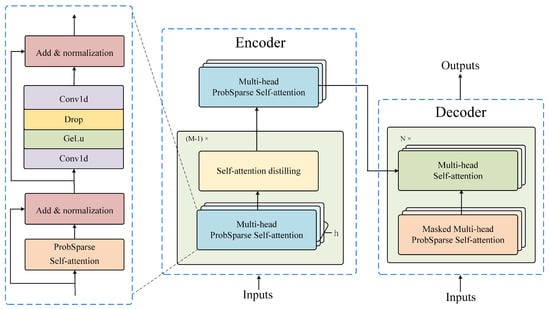 where represents ProbSparse self-attention. Conv1D performs convolution filtering with ELU activation function in the time dimension. MaxPool applies max-pooling layer; the stride is 2, which reduces by half after one layer and extracts the main features.