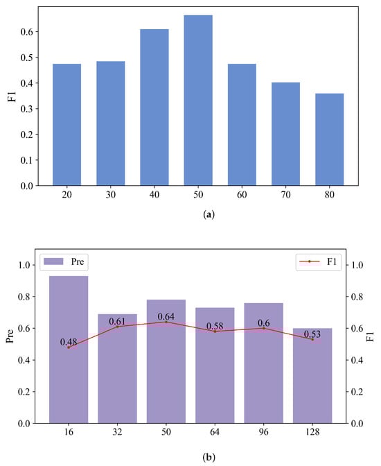 In Figure 3b, we try different batch sizes to observe the effects of Pre and F1. When the batch size is between 32 and 96, the accuracy is basically around 0.9, and the F1 is around 0.55. Therefore, batch size does not have a great impact on Pre and F1.