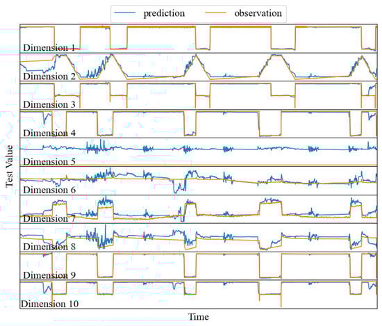 In order to observe the accuracy of our prediction, we present numerical curves of observed (true) and predict values for the first 10 dimensions of SWaT. In Figure 4, red represents the observed time series and blue represents the predicted time series. As we can see from Figure 4, the red and blue are essentially synchronized. This again demonstrates the effectiveness of our approach. We can judge which sensors are attacked based on the real values and predicted values.