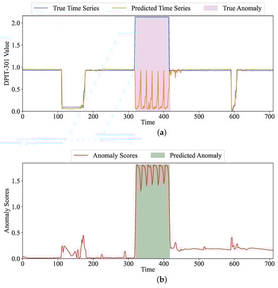 The true value, predicted value, and anomaly score of DPIT-301 in SWaT. (a) The true value and predicted value. (b) Anomaly score.