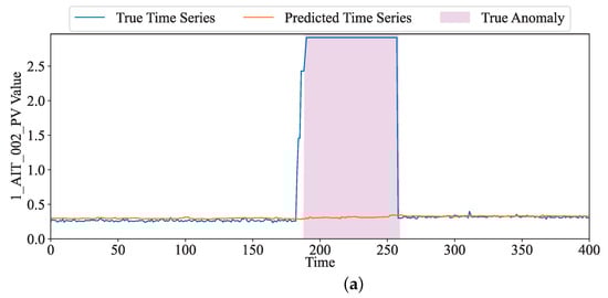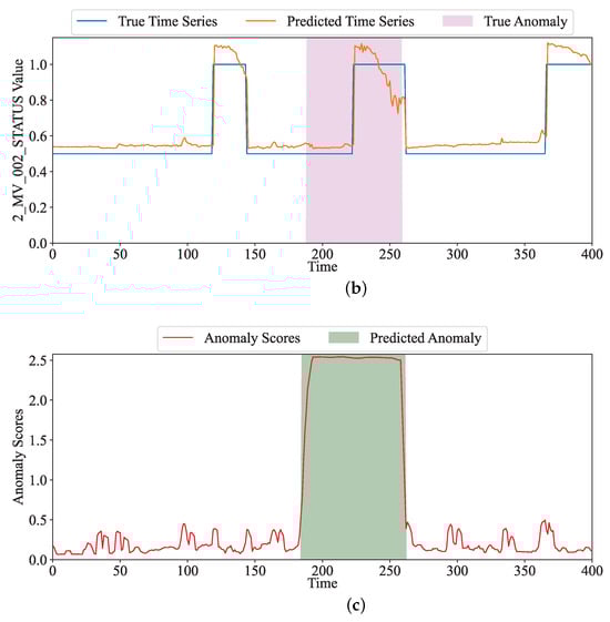 As shown in Figure 5, we selected the dimension DPIP-301 in the SWaT dataset to show how to locate and interpret anomalies. In Figure 5a, the red curve represents observed values and the blue curve represents predicted data using our method. The pink block indicates the true anomalous time. Between 320 and 420 in the time dimension, there is an obvious difference between the real and predicted values, and we can see that the sensor may be under attack during this time. Figure 5b displays the anomaly score and the location of the predicted anomalies. Specifically, as shown in Figure 5b, the anomaly score increases significantly during this period. We find that the true anomalies and our judged anomalies are the same. In the real scenario, DPIT-301 was attacked during this period. The attacker modified the value of the sensor, which would lead to the wrong execution of its subsequent sensors, then causing security incidents. Figure 6 shows the observed and predicted values of our model for sensors 1_AIT_002_PV and 2_MV_002_STATUS, as well as the abnormal score and abnormal judgments given by the model during this period. From the attack description, we obtain that the attack lasted for 11.38 min; the attacker set 1_AIT_002_PV to 6 in order to supply contaminated water to the Elevated Reservoir tank. Meanwhile, 2_MV_003_STATUS was opened. In Figure 6b, our method can reflect the state of 2_MV_002_STATUS well, which is consistent with the actual state. However, although the attacker set the sensor 1_AIT_002_PV as 6 (as shown in Figure 6a); different values based on the inputs are predicted by means of the model. Due to the significant difference between observation and prediction, we obtained a larger abnormal score during this period, and the system was judged under attack during this time (as shown in Figure 6c).