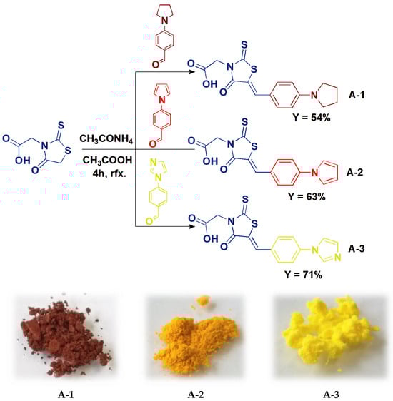 Synthesis of (Z)-2-(5-benzylidene-4-oxo-2-thioxothiazolidin-3-yl)acetic acid derivatives (A-1–A-3) and photographs of the obtained compounds.