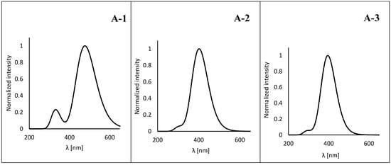 Moreover, the thermal properties of the obtained compounds were also examined. For this purpose, melting temperatures (Tm) were measured, and thermogravimetric analysis (TGA) was performed. To characterize the thermal stability of the presented derivatives precisely, parameters such as 5% (T5) and 10% (T10) mass loss and the maximum decomposition temperature (Tmax) were determined. The results obtained are presented in Table 1 and Figure S1. In the case of melting temperature (Tm), only the A-2 derivative (Tm = 262 °C) had it. Moreover, all compounds (A-1–A-3) were characterized by high thermal stability above 240 °C. Compound A-2 was the most thermally stable (T5 = 269 °C). The influence of the additional nitrogen atom in the aromatic imidazole ring is also clearly visible, which most likely reduces the thermal stability of the A-3 derivative. This compound shows a 5% weight loss, approximately 20 °C lower than other derivatives. Interestingly, when analyzing the maximum distribution values, it can be seen that A-3 has the best parameters (Tmax = 307 °C). In turn, A-1 completely decomposes at the lowest temperature of 284 °C.
