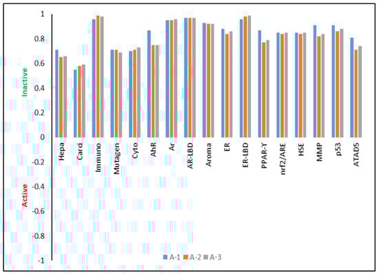 The tested derivatives are characterized by relatively good bioavailability. The theoretically calculated LogP value is 2.58, 2.70 and 2.35 (±0.25) for A-1, A-2 and A-3, respectively. According to Lipiński’s rule [60,61], in each case it is less than 5, which confirms the ability of the tested compounds to cross cell membranes and the ability to bind to enzymes or receptors at the site of their action. The LogBCF values of −0.116, −0.018 and −0.047 indicate that the tested derivatives will not be bioaccumulative in living organisms and will be easily excreted in the urine. Described molecules are characterized by high metabolism by CYP450-2D6 (probability (P) is 94.21%, 93.78% and 93.16%) and by CYP450-3A4 ( 92.45%, 90.69% and 91.81%). These quantities clearly indicate the rapid removal of compounds from tissues and the human body without interacting with other biomolecules and drugs. The theoretically determined oral toxicity LD50 values are 1345.00 mg/kg, 1929.00 mg/kg and 2180.00 mg/kg for A-1, A-2 and A-3, respectively. These values indicate that the tested systems should be treated as practically non-toxic. For the intraperitoneal route of administration, LD50 values are 430.00 mg/kg, 562.00 mg/kg and 621.00 mg/kg; for the intravenous route of administration, LD50 values are 331.10 mg/kg, 410.15 mg/kg and 499.00 mg/kg; for the subcutaneous route of administration, LD50 values are 356.60 mg/kg, 541.00 and 637.50 mg/kg. Moreover, the tested compounds do not show mutagenic (the probability of occurrence is in the range of 69–71%), cytotoxic (70–73%), immunotoxic (96–99%), hepatoxic (65–71%) or carcinogenic (55–59%) properties (Figure 3). The tested derivatives also show many other biological properties related to nuclear receptor signaling pathways and stress response pathways, and changing the substituent does not significantly affect the probability of occurrence of a given activity.