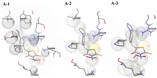To predict reactive sites for electrophilic (negative/yellow and red zones) attack and nucleophilic (blue/positive zones) attack of the tested derivatives, the Molecular Electrostatic Potential (MEP) surfaces were calculated (Figure S3). The most negative zone is located on the oxygen atom of the -COOH group and attached to the thiazolidine ring by a double bond. The maximum positive site accumulates on the hydrogen atom of the -COOH group. Changing the substituents, which are also susceptible to nucleophilic attack, does not change the arrangement of these zones. For A-1, the zone for nucleophilic attack, with a smaller positive charge, also extends over the pyrrolidine ring. However, the presence of an additional nitrogen atom in the aromatic substituent makes this area susceptible to attack by the electrophile. In turn, replacement with an imidazole ring causes the nitrogen of this substituent to become the place with the largest concentration of negative charge.