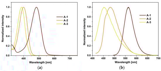 To ensure better characterization of compounds (A-1−A-3), the tests were performed in six organic solvents. The concentration of the samples was 2.5 × 10−5 mol/L. In addition, a solubility test of the sample compounds in water was performed. The collected data are presented in Table 2. All derivatives were insoluble in water. As a consequence, research in this environment was not possible. Moreover, A-3 was insoluble in toluene and acetonitrile. An absorption peak was recorded in solvents in which the samples were soluble. For compounds A-2 and A-3, it was in the range of 369–400 nm. For compound A-1, this peak was bathochromically shifted and was in the 460–482 nm range (Figure 5a). Compound A-1 exhibits a solvatochromic effect in UV–Vis spectra. As the solvent’s polarity increases, the band’s redshift is noticeable. This is typical of the ICT transition with an increase in the dipolar moment upon excitation [65,66], which results in more excellent stabilization of the more polar excited state in polar solvents [67]. For molecules A-2 and A-3, the solvatochromic effect was much less noticeable. The absorption of these compounds also results from intramolecular charge transfer (ICT) between the substituent and rhodanine-3-acetic acid via the π bridge [7]. Analyzing the location of the absorption bands of all derivatives, we see that the highest redshift characterizes A-1 (Figure 5a). This is due to the strong ability of the pyrrolidine unit to donate electrons to the acceptor via the benzene π bridge. In the case of A-2 and A-3, there is a significant hypsochromic shift relative to A-1. This may be due to the more planar nature of the pyrrole and imidazole rings. Such planarity may promote the delocalization of the lone electron pair of the nitrogen atom, which leads to a reduction in the electron-pushing effect [7].