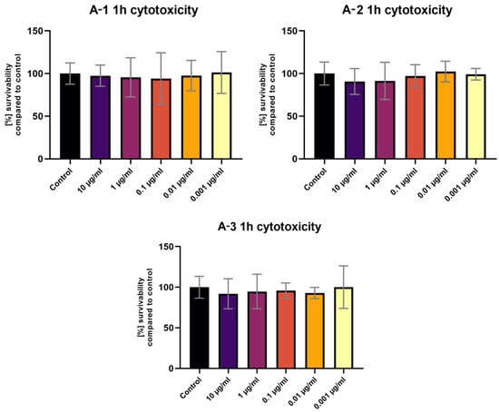 The 3T3 MTT assay results after 1 h of exposure to various A-1–A-3 concentrations. Results presented as % of survivability of untreated control. Statistical test used—one-way ANOVA with Dunnett’s post hoc (Cl at 95%).