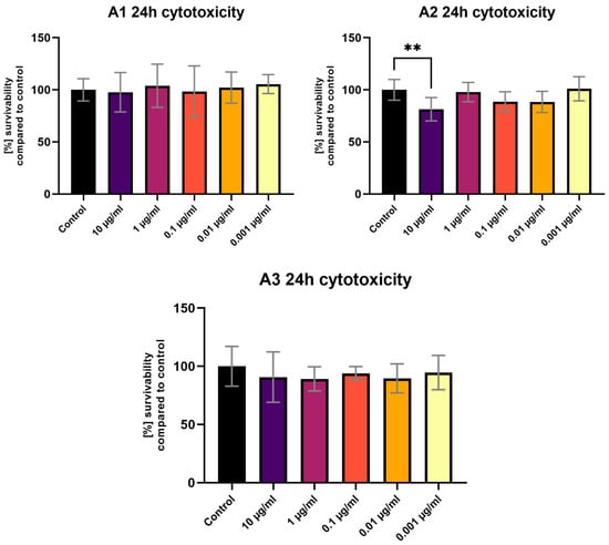 The 3T3 MTT assay results after 24 h of exposure to various A-1–A-3 concentrations. Results presented as % of survivability of untreated control. Results, significantly different from that of the control, are marked with [**]. Statistical test used—one-way ANOVA with Dunnett’s post hoc (Cl at 95%).