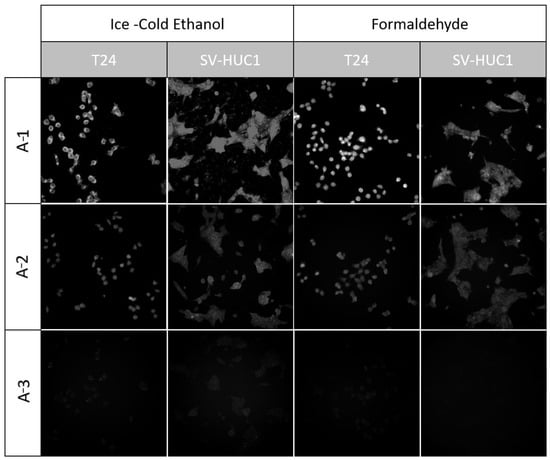 Both of the assessed cell fixation methods, 96% ice-cold ethanol and 4% formaldehyde, were compatible with the A-1 and A-2 compounds. During observation, cells stained with the A-3 compound showed only minor fluorescence using both fixation methods. The formaldehyde fixation enabled more uniform staining and preservation of cell morphology. No significant differences in staining effectiveness were noted between T24 and SV-HUC1 cell lines (Figure 8). After staining, none of the tested compounds presented fluorescence in the UV or 647/Cy3 channels.