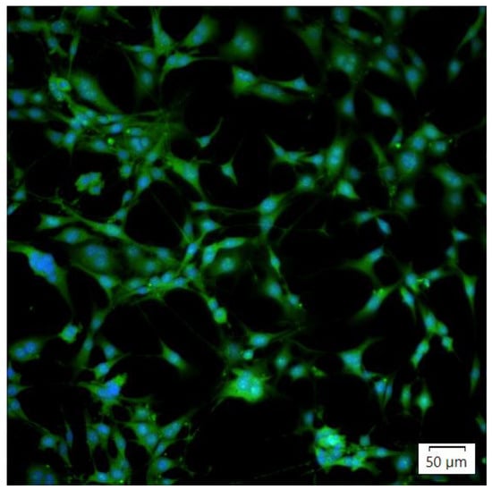 The MTT assay performed after a 1 h exposure of the tested compounds showed no statistically significant differences in viability compared to the control (Figure 6). The 24 h exposure (Figure 7) revealed a statistically significant decrease in viability for the highest tested concentration (10 μg/mL) of the A-2 compound (Figure 6). No fluorescence of cells in the live culture was observed after 1 h and 24 h of staining using tested compounds. Background fluorescence levels were high for A-1 and A-2.