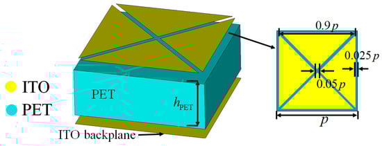 In order to have good optical transparency and flexibility, the designed metasurface is only composed of a top ITO-patterned film, a PET substrate, and an ITO backplane. The IR radiation intensity of the metasurface can be calculated by the Stefan–Boltzmann equation as , where is the IR emissivity, is the Stefan constant, and T is the temperature. As the temperature T of the metasurface is difficult to control, the IR radiation can be reduced by reducing . The IR emissivity of ITO increases with the increase of sheet resistance R. When R is less than 10 , is about 0.09 [31]. Since the operating wavelength range of the infrared band is only 3–12 m, which is much lower than the radar wavelength, the IR characteristics of the metasurface mainly depend on the top ITO film pattern. The IR emissivity of PET is . Then, the total IR emissivity can be calculated as , where is the filling rate of ITO. As the IR emissivity of PET is much larger than that of ITO, decreases with the increase of . But when = one, the incident radar wave is almost fully reflected, which cannot achieve the effect of reducing RCS. Therefore, the top ITO pattern can be made into a bandpass periodic array with a high filling rate. Figure 1 shows the basic unit cell of the metasurface. The ITO pattern consists of four triangular patches with a sheet resistance of = 5 , and the period size is p. This design allows the pattern to have multiple gaps, which can generate more resonant modes. The relative permittivity of PET is approximately three, and its loss on the incident wave can be ignored [37]. It can be calculated that and are 0.81 and 0.24, respectively.