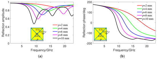 Figure 2 shows the reflection amplitude and phase of the basic unit at different period sizes p. The frequency range of the incident wave is 0–23 GHz, and the thickness of PET substrate is = 1.6 mm. These results were obtained using CST Studio Suite 2022 software. The frequency domain solver is adopted, where the “unit cell” boundaries were set in the plane and the "add open space" boundaries were set in the z direction. The reflection amplitude value is . Due to the absorption effect of ITO, it can be seen that the reflectivity is not one. As the increase of p, the reflection amplitude curve generates more resonances, with the lowest reflection amplitude of 0.54 at p = 10 mm. Therefore, a 10 dB RCS reduction will not be achieved by relying on the absorption of one particular size of unit. From Figure 2b, it can be seen that there are significant differences in the reflection phase of units with different period sizes. Therefore, units of different sizes can be arranged in a checkerboard shape, and the principle of reflect phase cancellation can be used to achieve wideband RCS reduction.