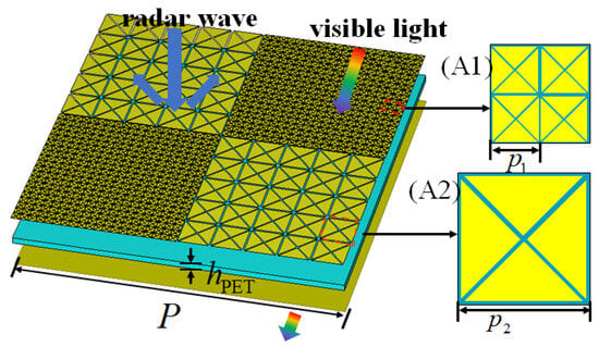 To make the metasurface have better polarization stability, two basic units of different sizes are used. Figure 3 shows a period of the proposed checkerboard metasurface, and also illustrates its working mechanism, which can scatter radar waves in multiple directions to reduce RCS in a specific direction, while having low IR emissivity and being able to penetrate visible light. The metasurface contains two different basic units A1 and A2, with periodic sizes of and , respectively. For a checkerboard metasurface containing two types of units, an approximated expression for RCS reduction is presented as in [26], as follows: